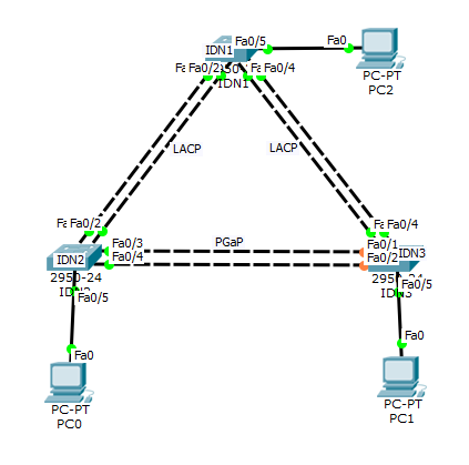Switch>enableSwitch#configure terminalEnter configuration commands, one per line. End with CNTL/Z.Switch(config)#hostname @idn3@idn3(config)#vlan 10@idn3(config-vlan)#name MARKETING@idn3(config-vlan)#vlan 20@idn3(config-vlan)#name SALES@idn3(config-vlan)#exit- ke SWITCH 2 PGaP@idn3(config)#int range f0/1-2@idn3(config-if-range)#sw mode trunk@idn3(config-if-range)#sw trunk native vlan 10@idn3(config-if-range)#channel-gr 1 mode desirable@idn3(config-if-range)#no shutdown- ke SWITCH 1 LACP@idn1(config)#int range f0/3-4@idn1(config-if-range)#sw mode trunk@idn1(config-if-range)#sw trunk native vlan 10@idn1(config-if-range)#channel-group 3 mode passive@idn1(config-if-range)#no shutdown